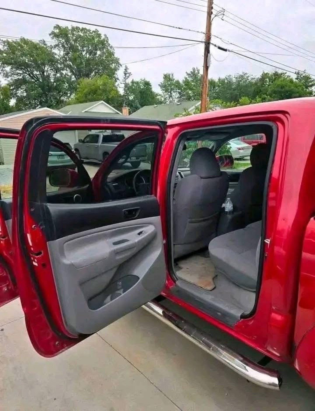Inside the cabin, the grey interior provides a clean and practical space for both the driver and passengers. The Tacoma comfortably seats up to five people, making it a versatile truck for families, workers, or anyone who needs extra passenger space.