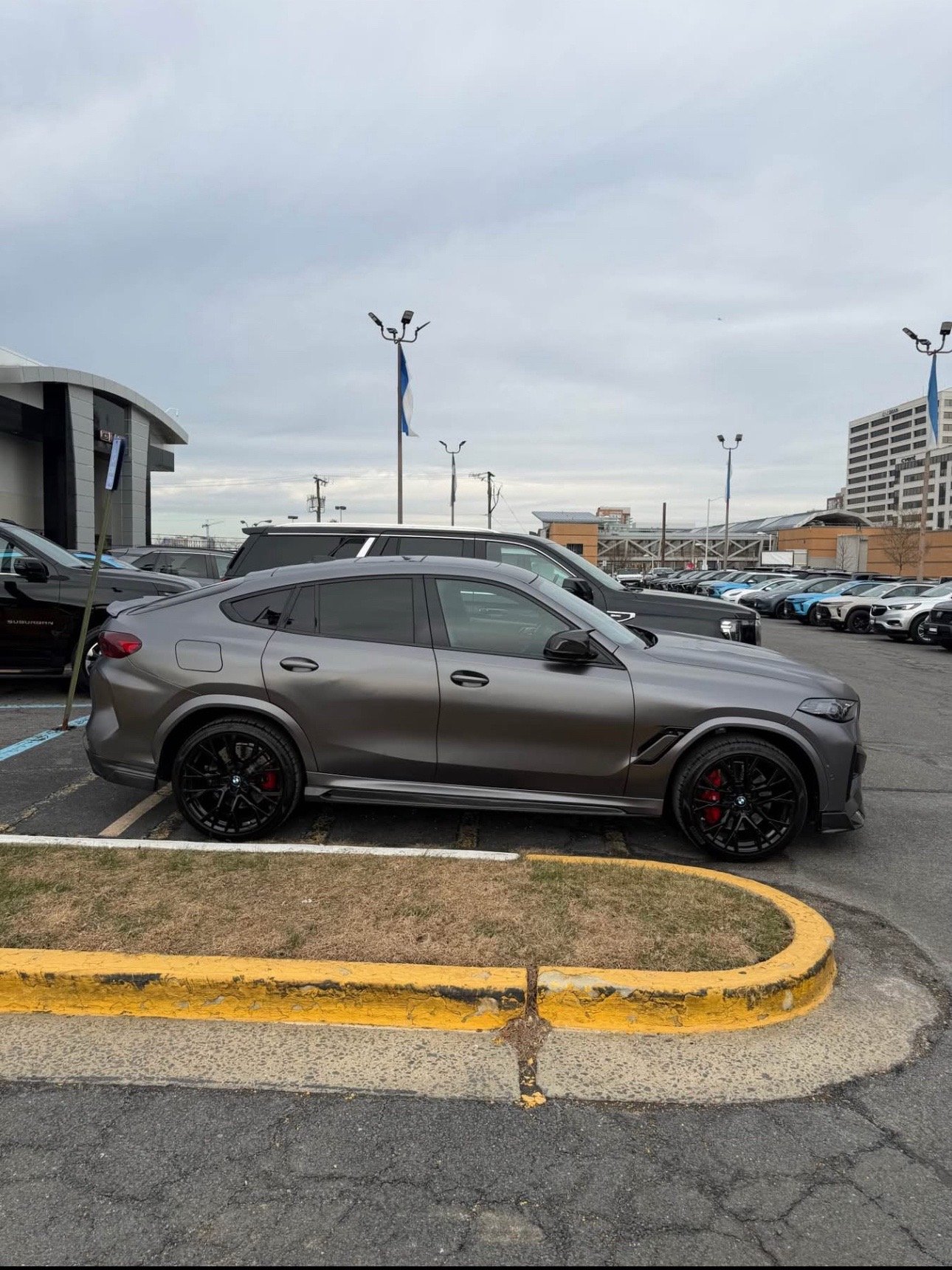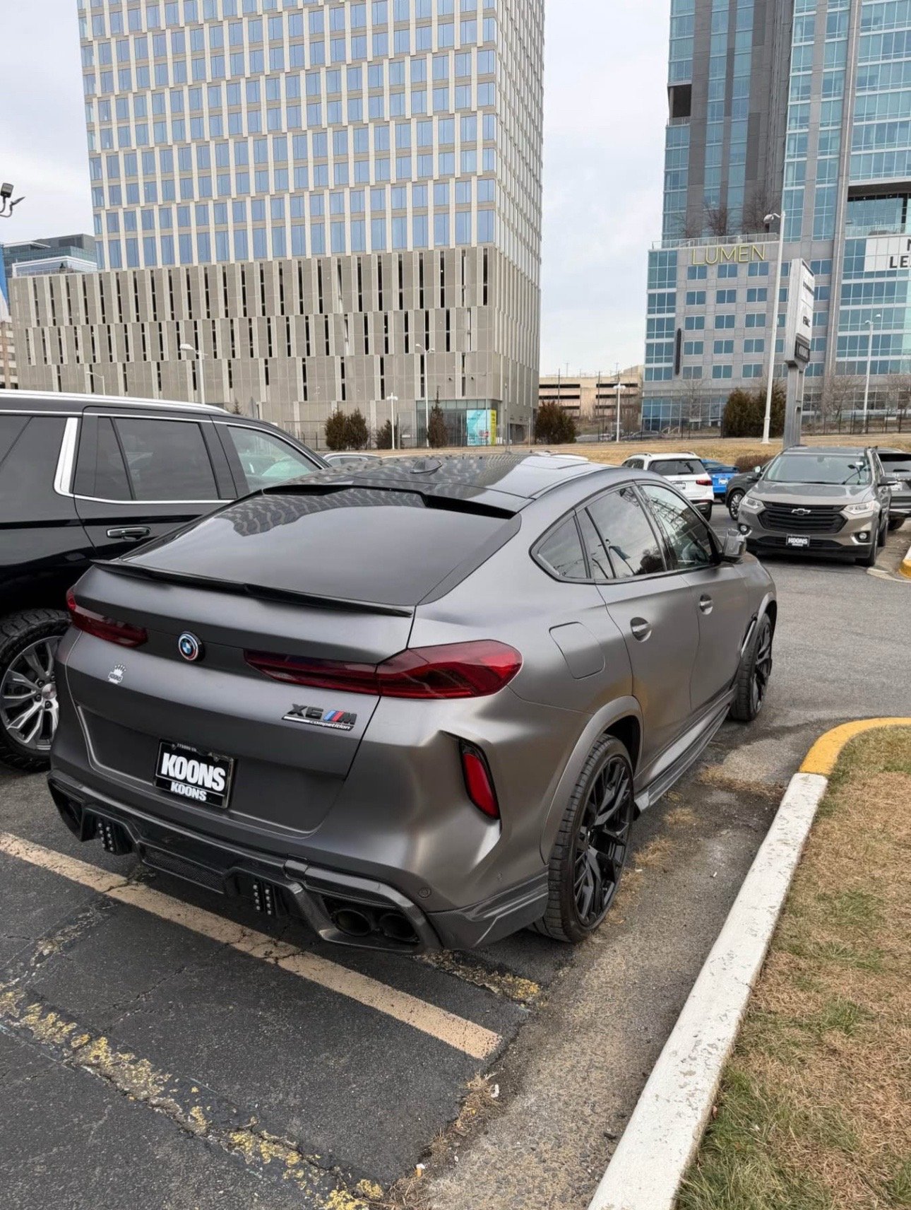 The design of the BMW X6 M is bold, sporty, and unmistakably BMW. Its Satin Gray wrap gives the vehicle a sleek and aggressive look while protecting the original Brooklyn Grey paint underneath. The coupe-style roofline adds a modern and athletic touch that sets the X6 apart from traditional SUVs.